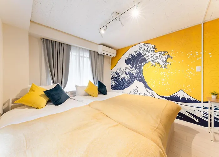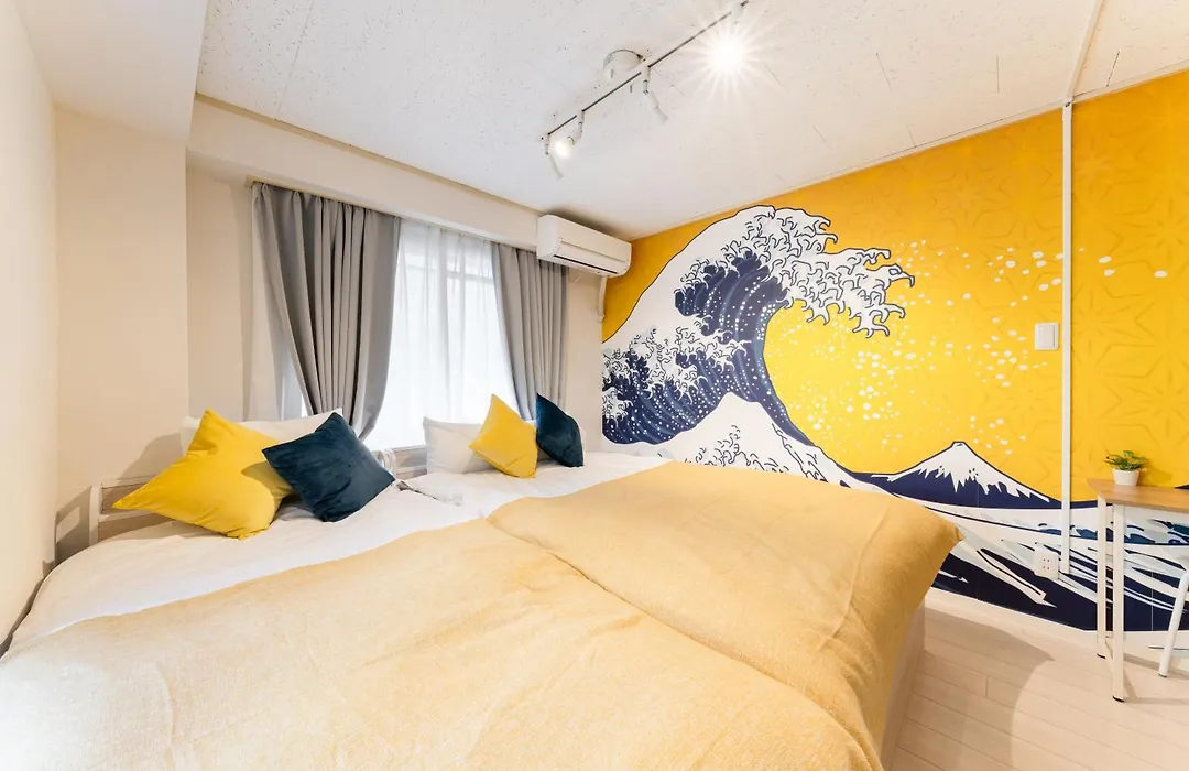 Japanese Art Room, 2Bed Room, 4Bed, Near Metro&Jr has a balcony and a fully equipped kitchen, and comforts such as climate control. A highlight of this accommodation for guests is the presence of hairdryers and towels in the bathroom. Additionally, you'll find a bidet, a separate toilet, and a washing machine.